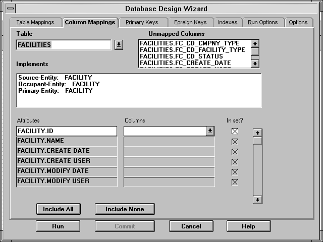 On the Column Mappings tab (see Figure 27.2), you can choose columns to generate initially or columns to regenerate. You might want to regenerate a table because it relates to a new entity or because you did more analysis and added new attributes to the