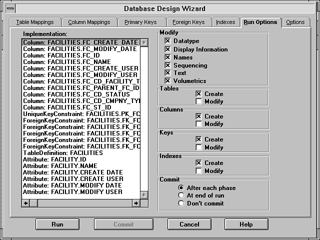 the entity. If you choose the Don't Commit option, the Wizard validates your choices but does not generate the tables. For the first time through, choosing this option is a good idea to ensure that your selections generate properly.