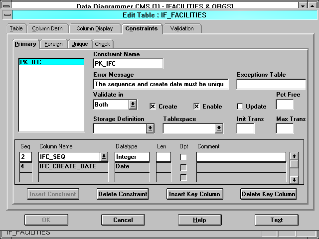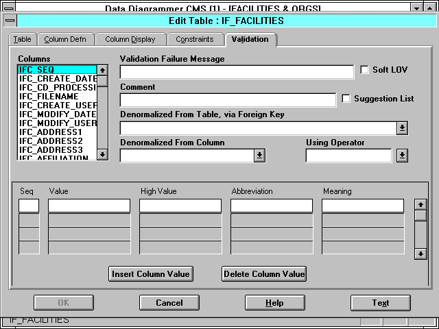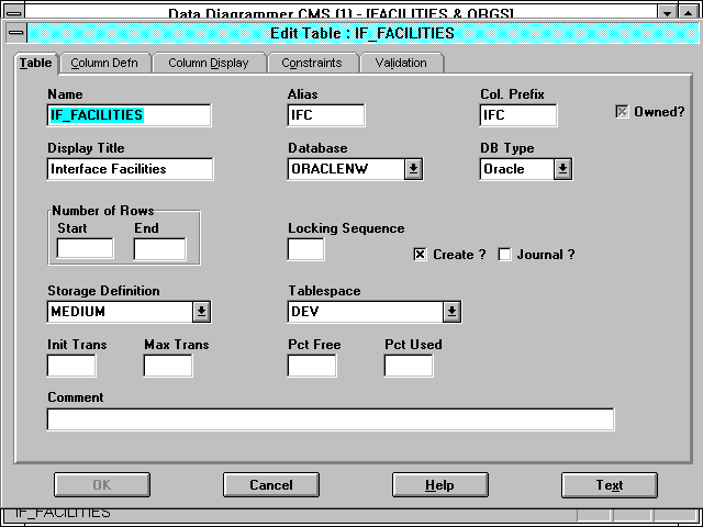 The Column Defn tab lists the definition information for columns. Tables generated from entities have columns named with the table prefix joined to the attribute name. Any spaces are replaced with underlines. Here you can edit column names, sequence,
