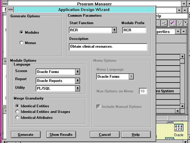 The Application Design Wizard selection screen appears (see Figure 27.9). You can select the start function level, the module prefix, the language options, the merge granularity, and whether to generate modules or menus.