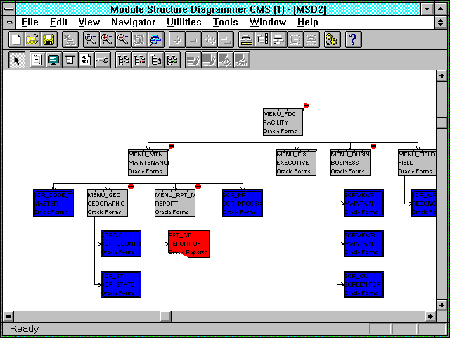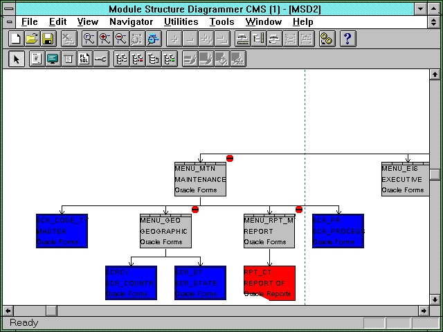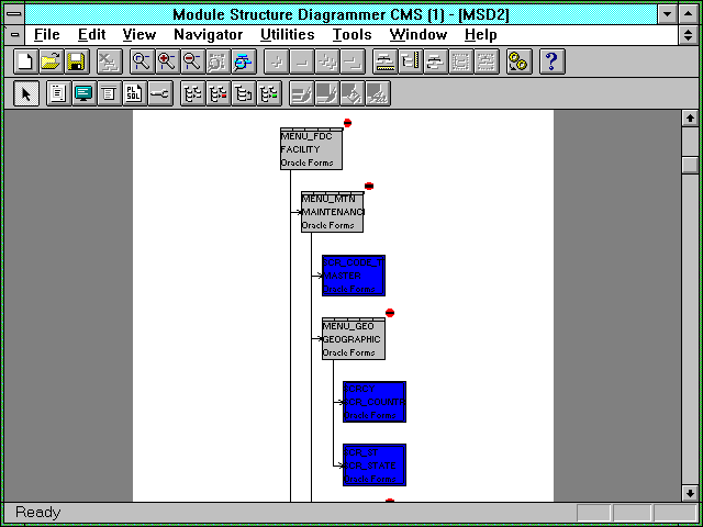 Some of the tools discussed in this chapterthe Data Diagrammer, the Module Structure Diagrammer, and the Preferences Navigatorhave very similar screen formats. At the top of the screen is a pull-down menu, as well as a toolbar of icons. All