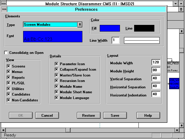 You can change the colors of module, the fonts of words, and the line width of module outlines and breakdown lines. By changing these items, you make the diagram more readable and add intelligence. For example, you can fill in all screen modules with