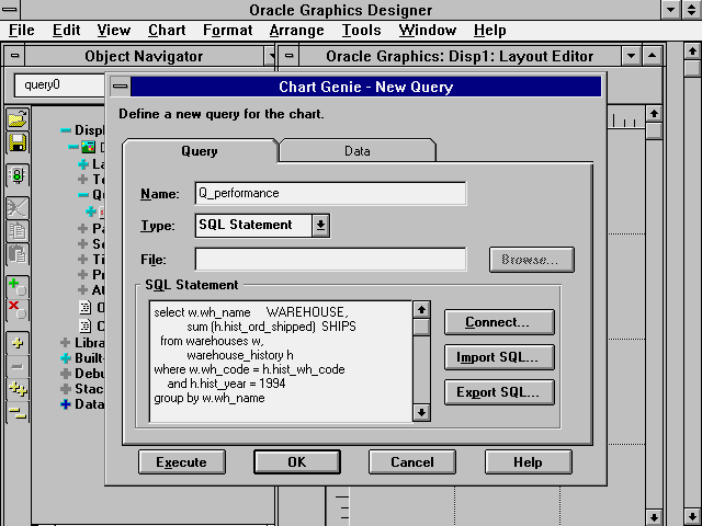 After you create the query, the developer can test it by clicking the Execute button at the bottom of the dialog box. (Note: You can use the Connect button to connect to the database if you have not yet done so.) The results of the query are shown in