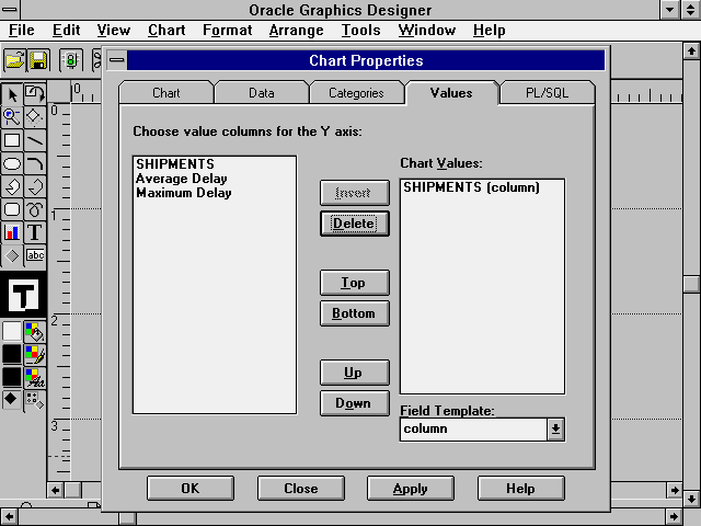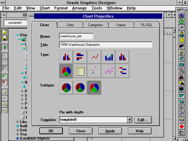 color palettes should be handled in Oracle Graphics. The options for the list box are Editable, Read Only - Shared, and Read Only - Private. Editable means that the color palette of the active chart will replace the system color palette. This shows the