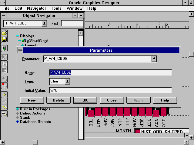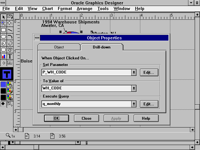The last modification for this chart is to dynamically modify the chart title at runtime. Instead of displaying a generic title, the title should include the name of the warehouse being displayed. Using the PL/SQL feature of Oracle Graphics, you can