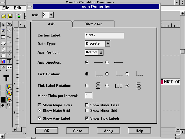 Oracle Graphics 2.5 provides two methods for customizing the axis labels for a chart. One way to define the labels is to use the SQL syntax method for creating a column alias directly in the select statement. (This syntax was demonstrated earlier in the
