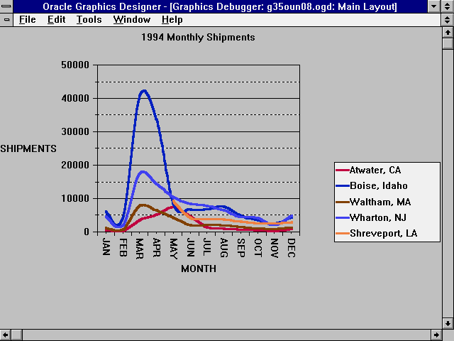 A break is a special type of chart that displays data for multiple similar entities on a single chart. An example of this chart is the monthly shipments shown in Figure 34.17. This chart shows the monthly shipments for all five warehouses plotted as