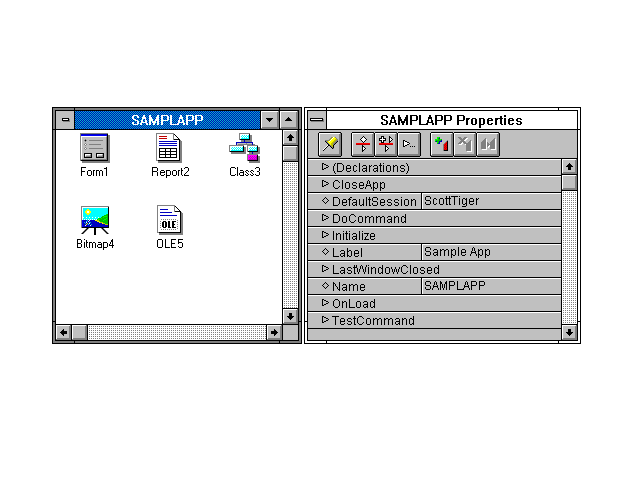 Forms, reports, classes, bitmaps, and OLE objects are the major components that makeup an application. The specific set of these objects that comprise any given applications are displayed as icons in the applications window. Figure 39.1 illustrates an application named SAMPLAPP that contains one of each of the main application objects: