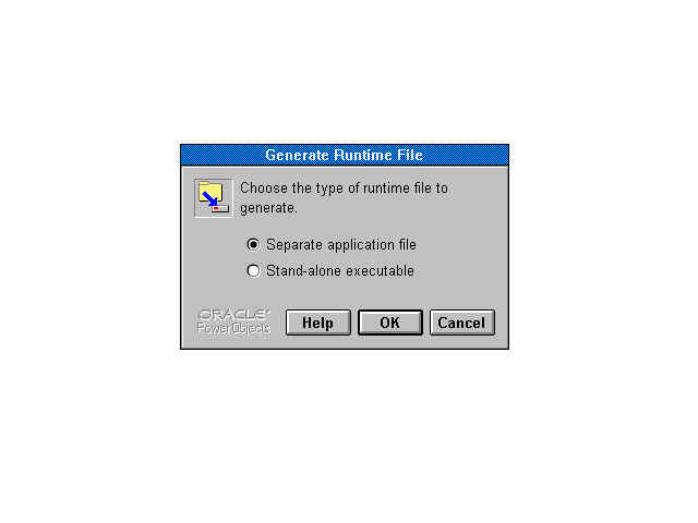 Creating a separate application file compiles the application and writes just the compiled p-code to a Power Objects (PO) file. This file can be executed using the OPO Runtime (PWRRUN.EXE). Compiling to a stand-alone executable first compiles the application to p-code, then binds it to a minimized copy of the OPO Runtime. This creates a self-sufficient executable (EXE) file. In either sense, the compiled application is executed via the OPO Runtime. Don't worry, the OPO Runtime is freely distributable which is something new for Oracle.
