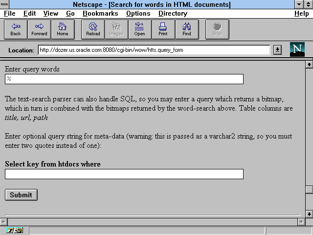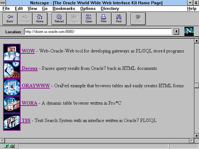 In early 1994, Oracle became the first major RDBMS to release a gateway for the WWW. Called WOW for Web-to-Oracle-to-Web, it was released into the public domain and remains the best means of getting Oracle databases on the Internet for little or no