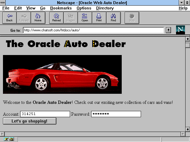 <H1> <IMG SRC="autotit.gif" alt="The Oracle Web Auto Dealer"> </H1> <IMG SRC="image/nsx.gif"><P> Welcome to the <STRONG>Oracle Auto Dealer</STRONG>! Check out our exciting new collection of cars and vans! <BR> <FORM METHOD="POST" ACTION="/cgi-bin/wow/auto.register"> Account: <INPUT TYPE="text" NAME="pCustid"> Password: <INPUT TYPE="password" NAME="pPassword"> <INPUT TYPE="submit" VALUE="Let's go shopping!"><BR> </FORM>
