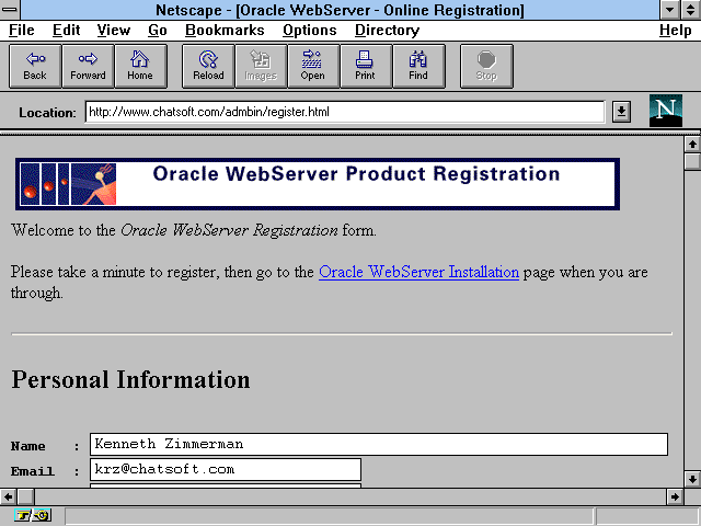 As indicated in the previous installation messages, connect to the WebServer using the URL http://www.chatsoft.com:8888/ows-abin/register. You see the screen in Figure 55.2.