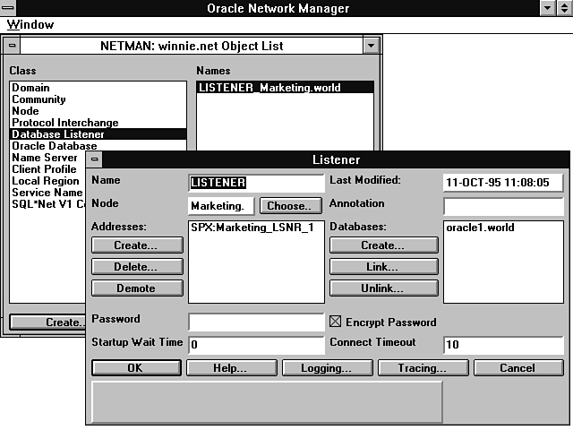 Before you start using SQL*Net Version 2, you might need to create or modify several configuration files, such as LISTENER.ORA and TNSNAMES.ORA. These files are not easy to create or modify manually because they need to follow certain syntax for different network protocols. The Network Manager for Windows is a graphical tool, and it enables you to create these configuration files by entering the necessary information on the screen. Before the Network Manager generates the configuration files, it validates the information that you enter and warns you if it discovers any inconsistency. Figure 57.1 shows the Network Manager dialog box.