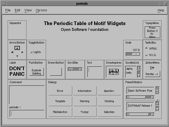 Motif applications look more like a Mayan temple than a menu system. Almost every item on the screen is rectangular. A rectangular button rests on a rectangular menu bar, which may rest on another rectangular form, which sits on a square window. We will