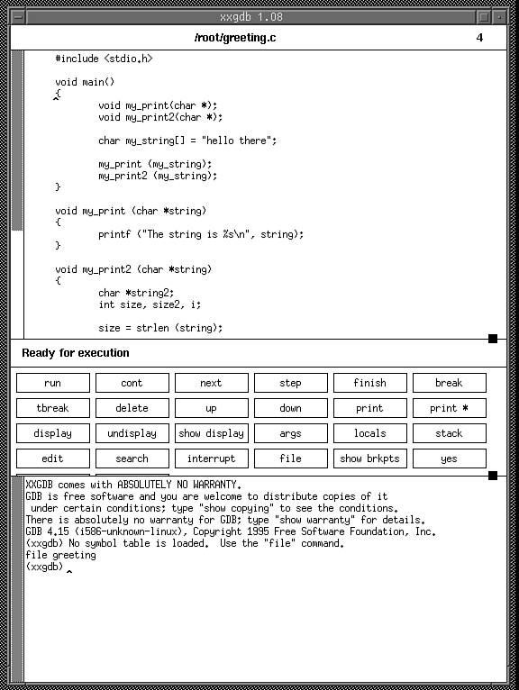 Try experimenting with the different features that this program provides and refer to the xxgdb and gdb manual pages for information on additional capabilities these tools provide.