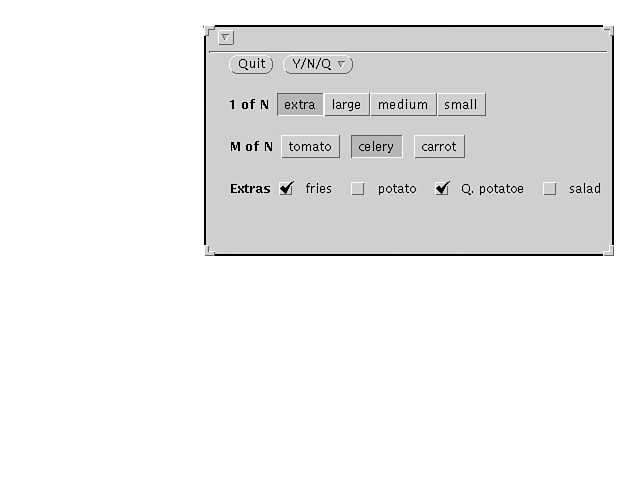 Note how the types of values are mixed in this function call. All attributes except PANEL_CHOICE_STRINGS take a single argument. The PANEL_CHOICE_STRINGS attribute takes a list of arguments. The list is terminated with a NULL value.