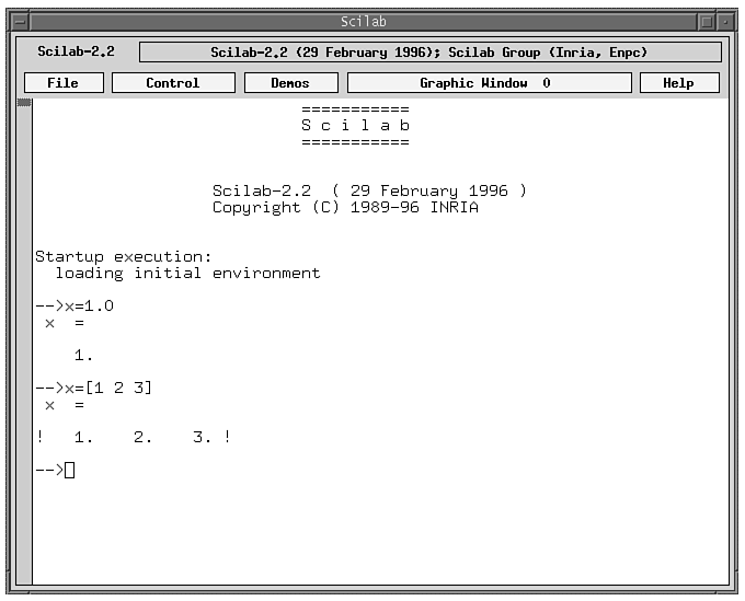 To invoke scilab, type scilab in an Xterm window while in the /usr/local/scilab-2.2/bin directory.