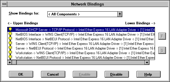 If TCP/IP is properly configured, you see the TCP/IP protocol bound to the network adapter card. The binding should be enabled, as shown by a yellow lightbulb to the left of the binding name. If it is not enabled, click the Enable button at the bottom of the window. If other protocols, such as IPX/SPX, are bound to the same network card and enabled but not needed, you should disable them. Only leave the bindings that you need enabled.