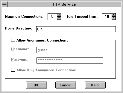 You might notice that the bottom part of the screen lets you set the FTP server to enable anonymous connections. You can set the anonymous login and password if you want. This enables users who are not on the authorized Windows NT Users' list to transfer files from the Windows NT machine. It is a good idea to restrict access to a subdirectory where there are no sensitive files available.