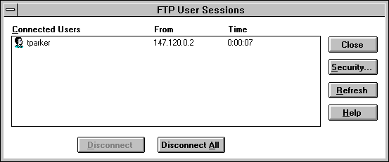 You can monitor the behavior of the FTP server system through the FTP Server icon on the Control Panel. This displays a window like the one shown in Figure 9.8, which lists all active users. The Disconnect and Disconnect All buttons at the bottom of the window can be used to force users off the Windows NT machine.