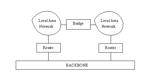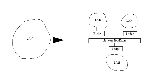 Bridges can be used when splitting a large LAN into smaller networks. This is often necessary when a LAN continues to expand as new equipment is added. Eventually the network traffic becomes bottlenecked. A useful and relatively easy solution is to divide the larger LAN into smaller LANs connected over a backbone. This helps conform to the 80/20 rule, while simplifying the traffic and administration overhead. This is shown in Figure 13.4. If the backbone is carefully chosen with lots of excess capacity, this type of topology can account for sizable future growth.