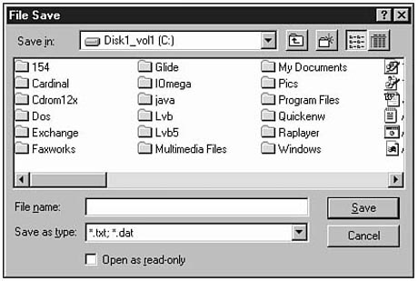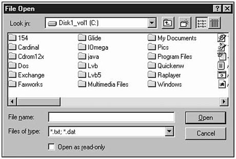 Surely you've seen the File Open dialog box in many Windows applications. The dialog box works just like it does in Microsoft Word and other applications; the user can select a pathname or a filename, change the view by clicking one of the View buttons, open the file as read-only so no changes are made to the file, and even select another drive or computer to choose from by clicking the Look in drop-down list box.