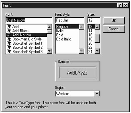 The Font dialog box, shown in Figure 12.4, is another common dialog box that the Common Dialog Box control can display for you. When your application works with text, you should give your user the chance to select a font name or style. Your application cannot always know in advance which fonts the user will have on his system. The Font dialog box will, however, give the user a chance to select font information from the user's own computer. Once selected, your application can use the user's selection values to generate the text in the selected font.