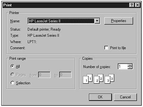 The Print dialog box, shown in Figure 12.5, displays a common printer dialog box