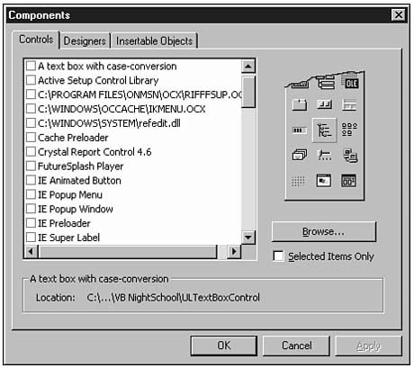 TIP: Search the Internet and Microsoft's home pages for additional ActiveX controls you can drop into your toolbox by selecting the tool from the Components dialog box. (You may have to click the Browse button to locate controls found in places other than your Windows\System folder.) An ActiveX control is identical to the toolbox's intrinsic controls and performs work when you set its properties and when you use methods and events related to the control.
