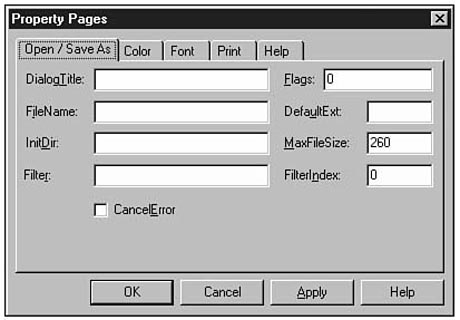 Figure 12.9 shows the tabbed Custom dialog box that appears when you click the Custom property. You'll see tabs across the top that display properties sheets for Open/Save As, Color, Font, Print, and Help dialog boxes. The properties sheets don't offer all properties, but the properties sheet does make entering the most common properties for each kind of dialog box easier.
