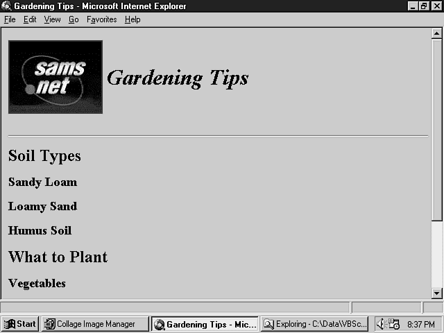 While it is not the purpose of this guide to teach you how to use HTML, this section lists some of the more familiar and important keywords that are used in an HTML document. If you don't know HTML at all, you need to become somewhat familiar with it. You might consider Lemay's Teach Yourself Web Publishing with HTML 3.2, Professional Reference Edition by Sams.net Publishing. It will teach you everything you need to know to create basic Web pages. You might also want to keep an eye on Microsoft's Web site, http://www.microsoft.com, since any late-breaking technologies, as well as help information, free programs and controls, and other important information, can often be found there.