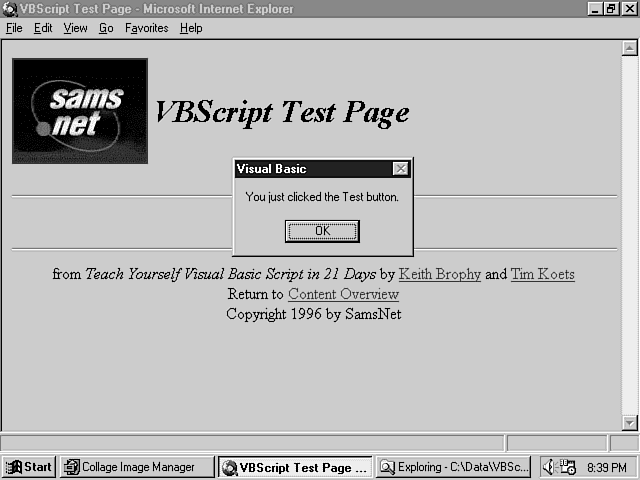 As you can see, the Web page includes a button that, when clicked on by the user, results in a message box being displayed (the message box is also shown in Figure 3.3). You will begin learning the details of this Web page tomorrow. The code used to create the Web page shown in Figure 3.3 works fine because the browser recognizes VBScript. If the browser didn't, the comments between the script tags would prevent the code from being displayed in the Web page.