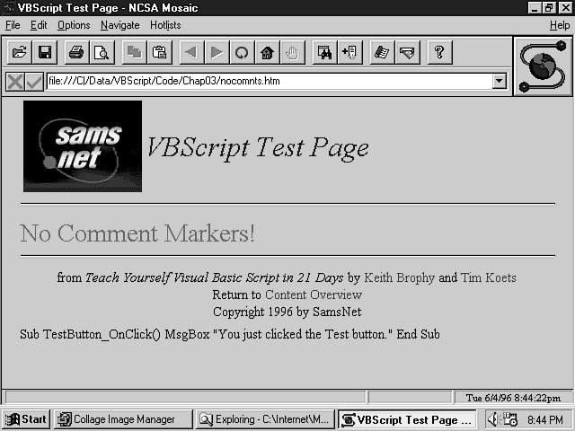 Rather than using the Internet Explorer, which supports VBScript, observe the Web page using Mosaic, which at the time of this printing did not support VBScript. The Web page is shown in Figure 3.4.