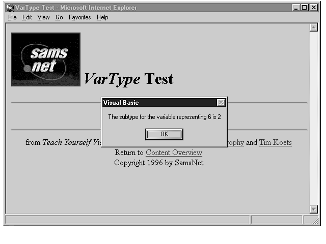 VBScript is a new product, but it is a language derived from its parent product, Microsoft Visual Basic. VBScript is essentially a subset of Visual Basic. When you create variables in Visual Basic, you have the opportunity to specify what type of data you want to store in a variable. If, for example, you want to store integers in a variable, you can declare the variable as an integer variable using the integer data type. As a result, if you try to store anything other than an integer in the variable, Visual Basic either converts the data automatically into integer format or tells you the assignment cannot be made. If you can be specific about the type of data you are storing, your code has the potential to be less error prone because you make fewer mistakes when assigning data to variables. On the other hand, it is advantageous not to worry about restricting a variable to specific types of data. Visual Basic also gives you the choice of creating variables where it doesn't matter what kind of data you want to store. This special type of variable is called a variant.