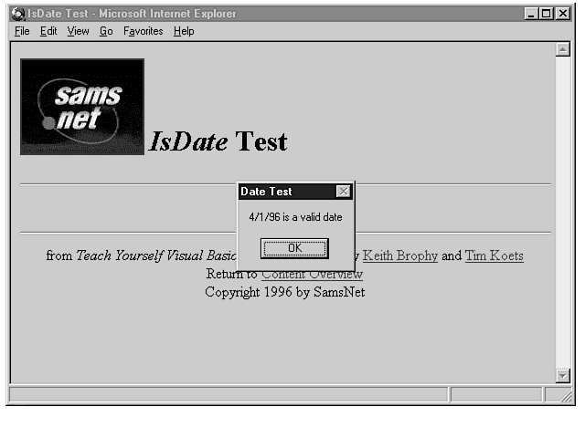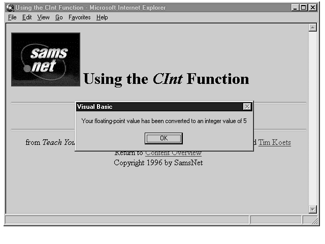 You've made it through the first day that teaches you how to write VBScript code! As you learn more about VBScript and its capabilities, all the concepts you are learning now will not only start to make more sense, but you will also begin to use VBScript in increasingly more powerful ways. A few days from now you'll be well along your way, developing powerful and fun Web pages. You can't get there without first learning the fundamentals, and this is the first lesson where you do just that. In tomorrow's lesson, you will learn how to put variables to use with operators. Day 5 is also when you will learn how to use arithmetic with your variables, compare one variable to another, set the contents of variables, and work with strings. Then, on Day 6, you will learn how to control the flow of your code and create procedures. Day 7 gets into more details on procedures, and on Days 8 and 9, you'll learn about the intrinsic HTML controls. Then, when you reach Day 10, you'll be ready to learn the powerful ActiveX controls.