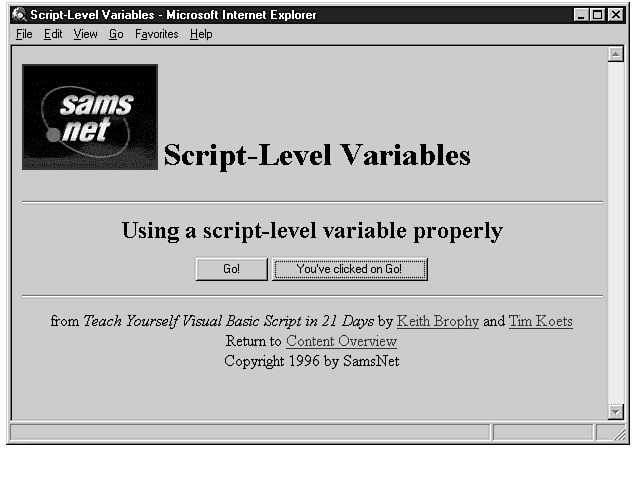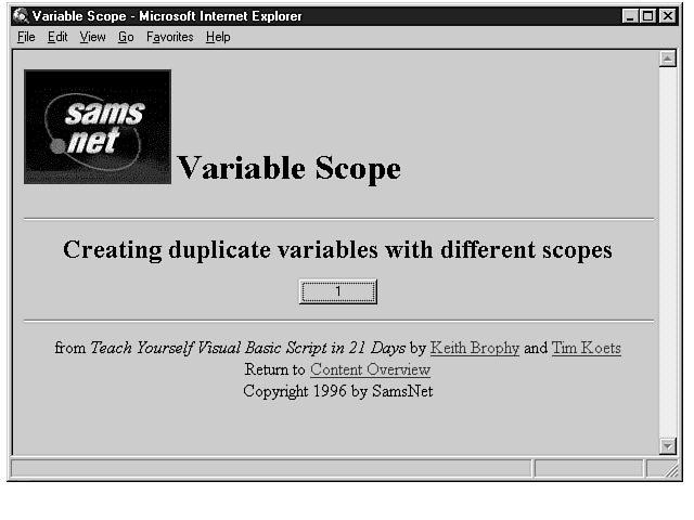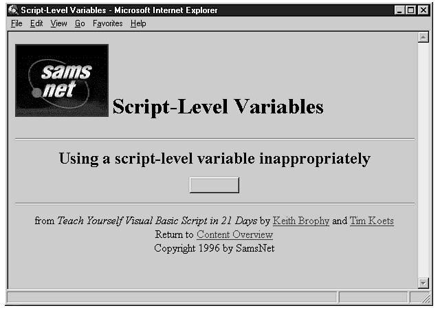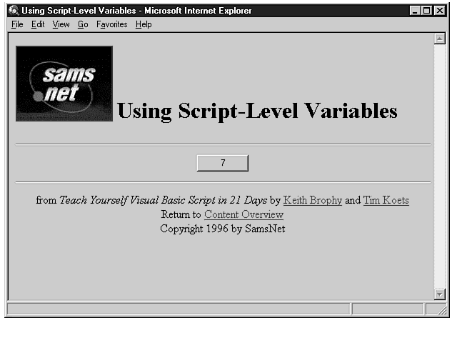 If you've worked through the first three days, you should have a pretty good feel for what VBScript is and how it's used in a Web page to enhance its capabilities. Today begins a series of lessons that will teach you how to write VBScript code. Today, I will teach you how to create and use variables. Variables are necessary to create useful code with VBScript. You will learn how a variable is created, what can be stored within it, and how long a variable can remain in existence once you've created it. Variables are a fundamental part of any programming language, and this lesson will teach you everything you need to know about them.