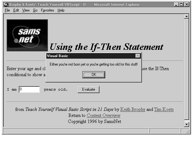 This listing is for a Web page that takes as an input the user's age. When the user clicks the Test button, the conditional statement checks to see whether the user's age is valid. If the person enters zero, a negative number, or a value greater than 120, he is either the world's oldest VBScript user or he has made a mistake in entering his age, and a message box appears on the screen telling him so. Figure 6.1 shows the Web page.