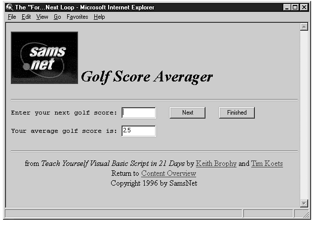 You can see an example of the Do While Loop in action in a slightly revised golf average example. Here, the user once again enters golf scores to average them, but this time, things are handled a bit differently. Figure 6.5 shows the Web page, which is stored as golfdwlp.asp.