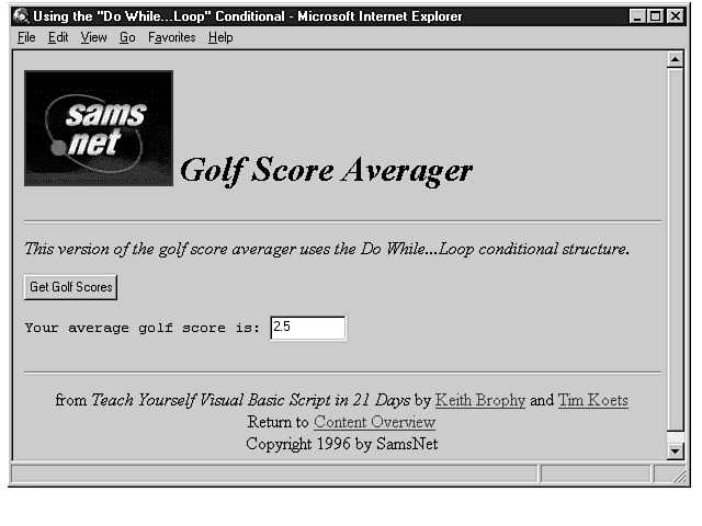 In this example, the user simply clicks the Get Golf Scores button, which proceeds to ask the user for a score using a special function called InputBox. We discuss this function in detail on Day 14, "Working with Documents and User Interface Functions." For now, just think of this function as a box where you put in a message for the user and out comes whatever he's entered in the box. If the user doesn't enter anything at all when the input box appears on the screen, the function returns an empty string, or "". The page shown in Figure 6.5 is asking the user for golf scores. Listing 6.8 shows the code that accomplishes this.