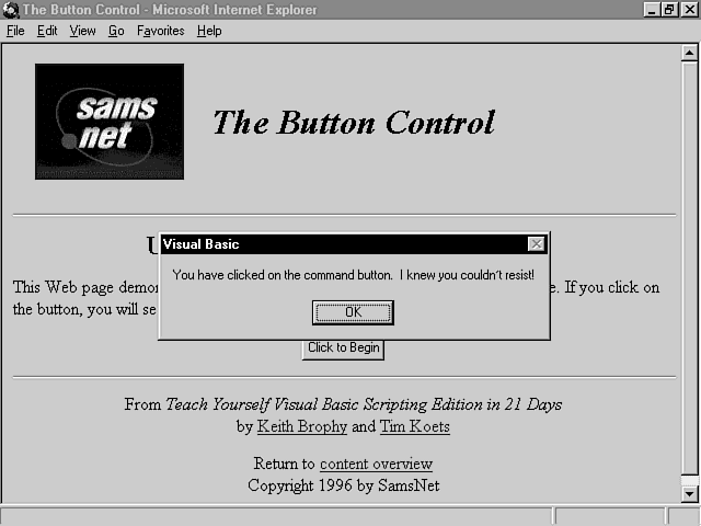 How do you go about connecting the button with VBScript code? Quite easily, in fact. On Day 7, "Building a Home for Your Code," you learned about a special procedure called an event procedure. You saw that event procedures are designed to respond to events initiated by the user, usually on controls. To get your VBScript code to respond to a button click, you have two options. First, you can use the implicit event procedure, which has the following format: