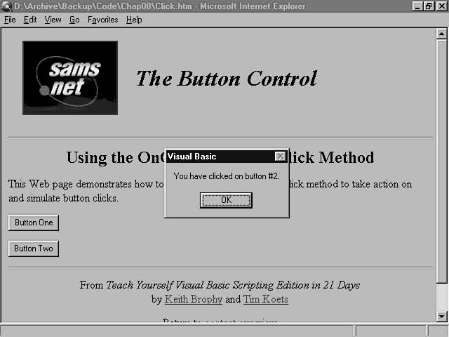 where ButtonName is the name of the button. You gave the button this name using the NAME property of the input tag when you created it. Consider Listing 8.2, which shows VBScript code that responds to the click of the button by showing the user a message box.