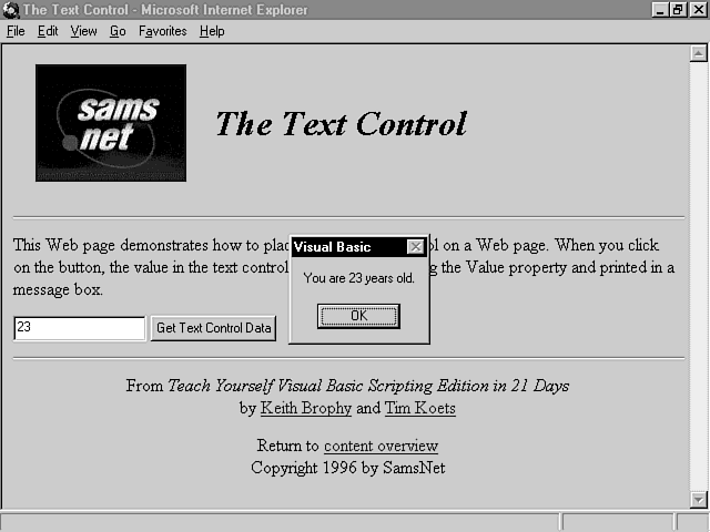 Now that you've learned some of the important fundamentals of VBScript programming, it's time to see how you can put these skills and techniques to practical use. This is the first of several days this week that will teach you how to use scripting elements. Scripting elements reside within an HTML document. They include intrinsic HTML controls and objects that you can insert into HTML such as ActiveX controls. Controls and objects are entities you can place on a Web page to provide an interface to the user that enables him to interact with the page. You can also use them as the front ends to perform behind-the-scenes operations, such as submitting information to a program on a server.