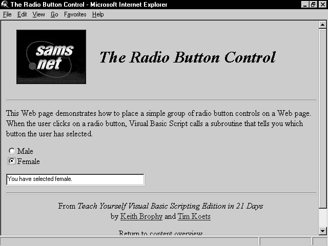 In this example, notice that the user has selected both the male and female radio buttons! Obviously, this is not what you intend in your program. What's the problem? You haven't placed the buttons in the same group. Placing them in the same group makes VBScript realize that only one button in the group can be selected at a time. When you select one, all the others in the group are deselected. In this case, you have effectively placed both buttons in their own groups, which means that the user can click on both. The section of incorrect code is shown here: