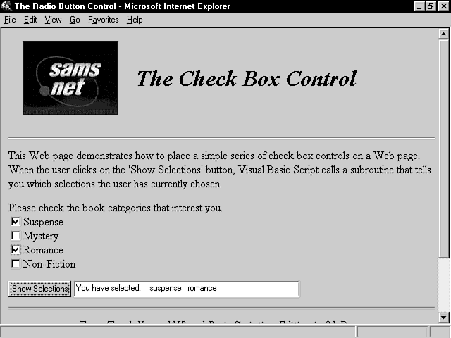 The next control covered today is the check box control. Like the radio button, this control also presents the user with a list of choices. In this case, however, the user can make more than one choice from the list. A square with a check mark or an ¥ inside appears when the user makes a selection. You have also learned how to place this control on a form as well as how to integrate it into VBScript.