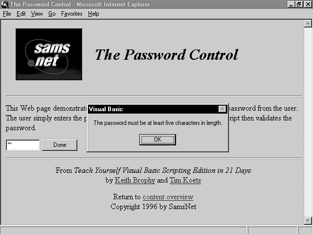 When the user clicks the Done button, the event subroutine for that button executes. The contents of the control are assigned to a variable. Then, the script uses a special function called Len to ascertain the length of the string the user has entered. If the length is less then five, the user hasn't entered a valid password and he is notified accordingly. The script deletes the text in the box, and the user must start over. Otherwise, you could submit the password to a server, for example, to see if it is valid.
