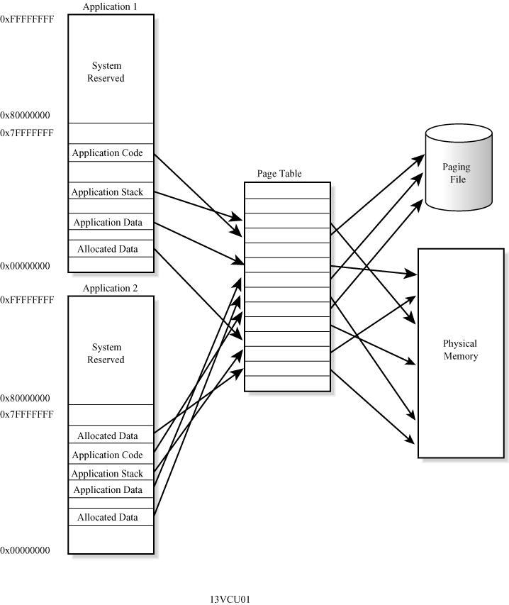 Figure 13.1 might appear to suggest that pages of virtual memory must always be mapped to either physical memory or a paging (or swap) file. This is not the case; Win32 memory management makes a distinction between reserved pages and committed pages. A committed page of virtual memory is a page that is backed by physical storage, either in physical memory or in the paging file. In contrast, a reserved page is not backed by physical storage at all.