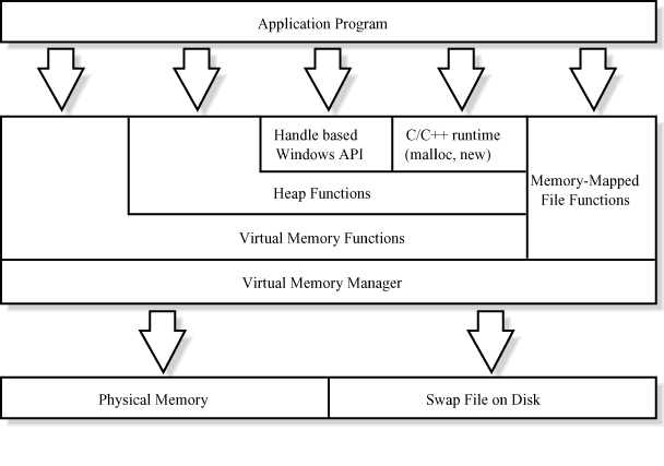 At the top of the hierarchy of memory management functions are the standard Windows and C run-time memory management functions. As noted earlier, these functions are likely to prove adequate for the memory management requirements of most applications. Handle-based memory management functions provided in the Windows API include GlobalAlloc and LocalAlloc, GlobalLock and LocalLock, GlobalFree and LocalFree. The C/C++ run-time library contains the malloc family of functions (malloc, realloc, calloc, free, and other functions). These functions are safe to use and provide compatibility with the 16-bit environment, should it become necessary to build applications that can be compiled as both 16-bit and 32-bit programs.