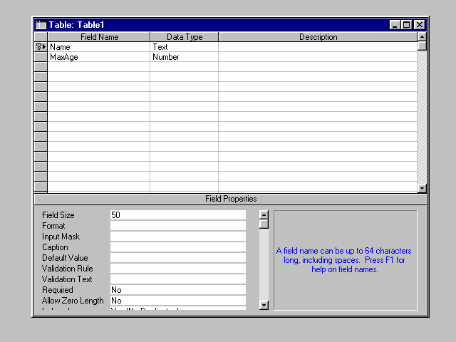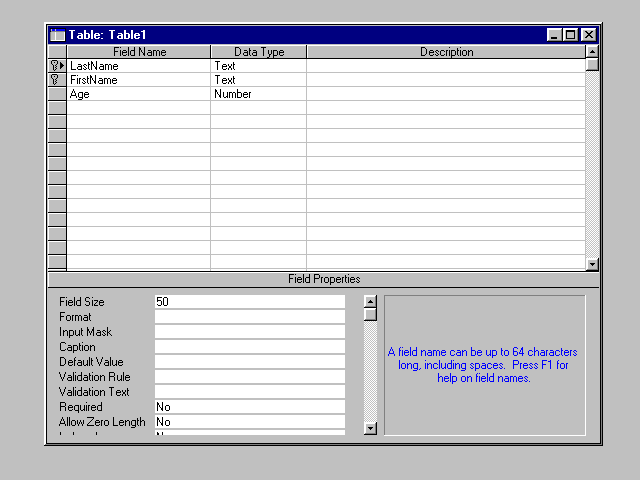 Figure 34.2 shows the newly constructed Employees table just before it is saved. As you can see, three fields were added (LastName, FirstName, and Age) of which the first two are 50-character-wide text fields, the third is a number field. The table's primary key was set to the combination of the LastName and FirstName fields.