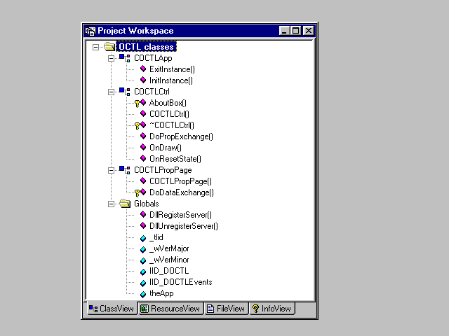 If you look at your project in ClassView (Figure 36.5), you can see that the ControlWizard generated three classes for you. One represents the custom control library object; the other two represent the control object and the control's property page. (If you elected to create a project with more than one control, additional pairs of classes were also created by ControlWizard to represent additional control objects and their property pages.)