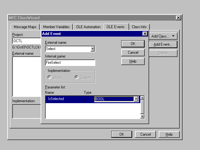 To add the Select event, click on the Add Event button. In the Add Event dialog, type Select as the event's External name. As you do that, ClassWizard automatically sets the internal name (the name of the function that causes the event to be fired) to FireSelect. Make sure to also add the IsSelected parameter to this event (this parameter will tell the recipient of the event whether the control has been selected or deselected) and specify this parameter's type as BOOL (Figure 36.11).